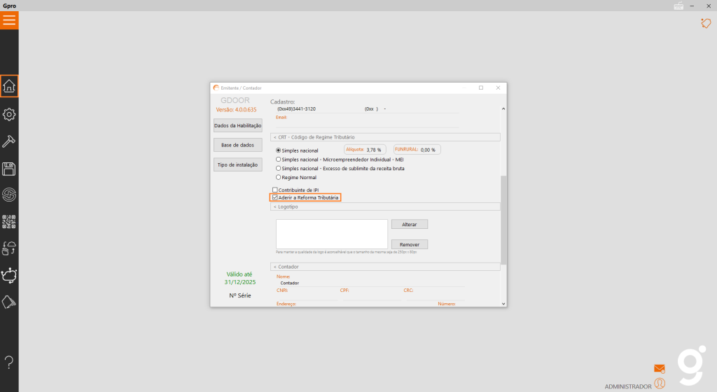 Acessando o cadastro do Emitente do Gdoor, está disponível um campo para aderir à Reforma Tributária.
