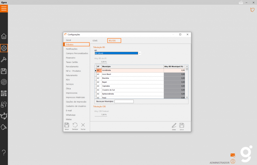 No módulo “Configurações” do Gdoor, clique no menu “Tributos” e selecione a aba “IBS/CBS”. Escolha o Estado no campo “UF”, encontre o município desejado e insira o percentual da alíquota municipal aplicável.