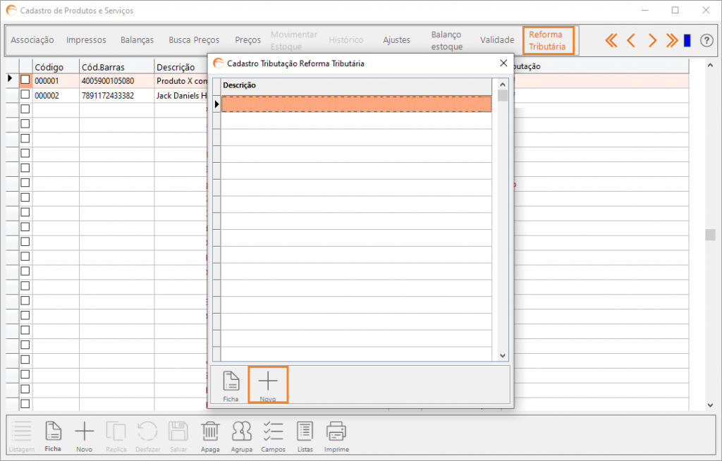 No módulo “Cadastro de produtos e serviços”, clique no botão “Reforma Tributária” e em seguida no botão “Novo”.