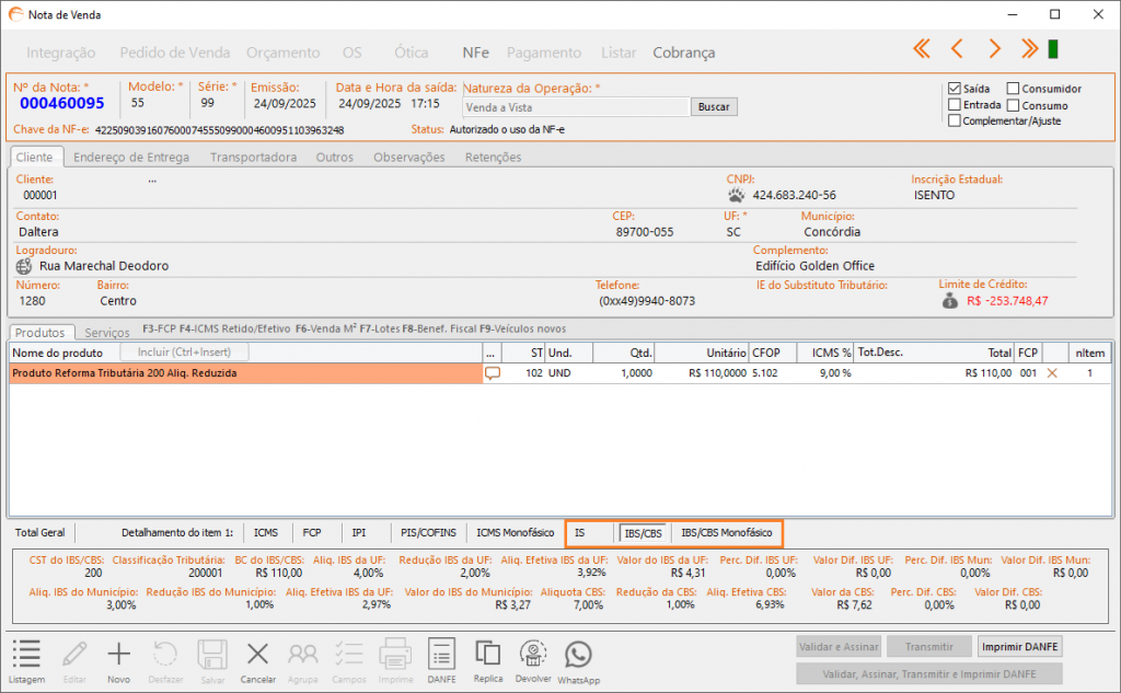 Ao lançar uma NF-e, estão disponíveis os botões “IS”, “IBS/CBS” e “IBS/CBS Monofásico”, cada qual trazendo os campos com os valores referentes aos novos impostos, de acordo com a configuração realizada nos produtos.
