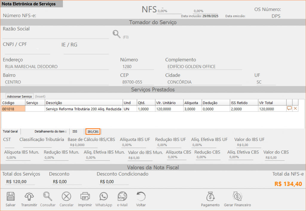 Ao lançar uma NFs-e, está disponível o botão “IBS/CBS”, trazendo os campos com os valores referentes aos novos impostos, de acordo com a configuração realizada nos serviços.