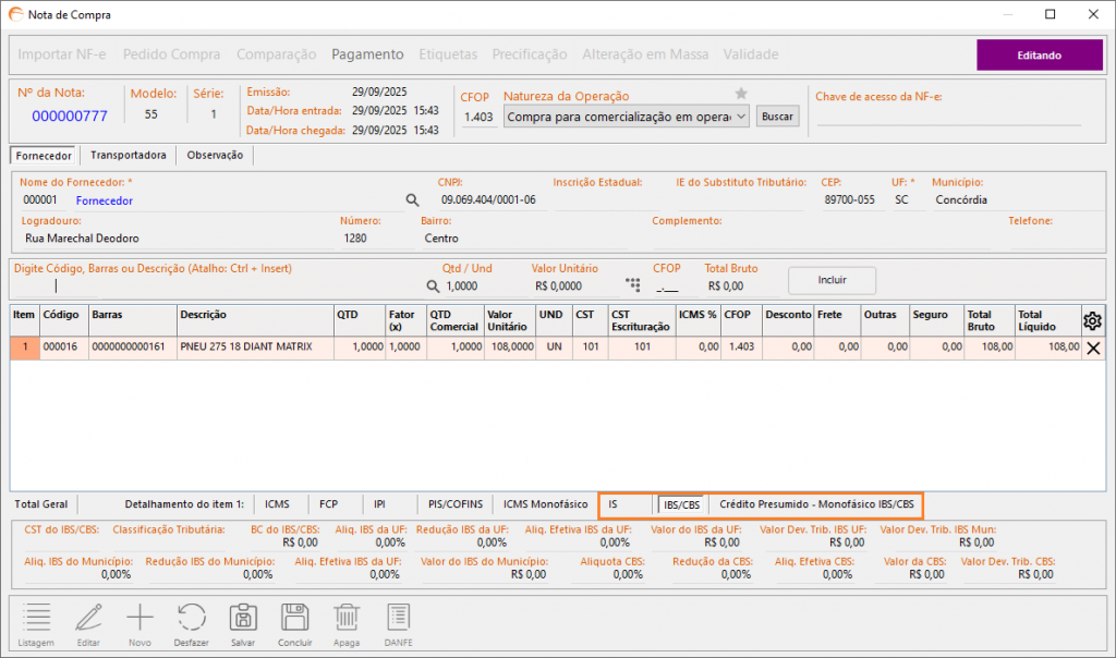 Ao lançar uma nota de compra, estão disponíveis os botões “IS”, “IBS/CBS” e “Crédito presumido – Monofásico IBS/CBS“, cada qual trazendo os campos com os valores referentes aos novos impostos, de acordo com a nota encaminhada pelo fornecedor.