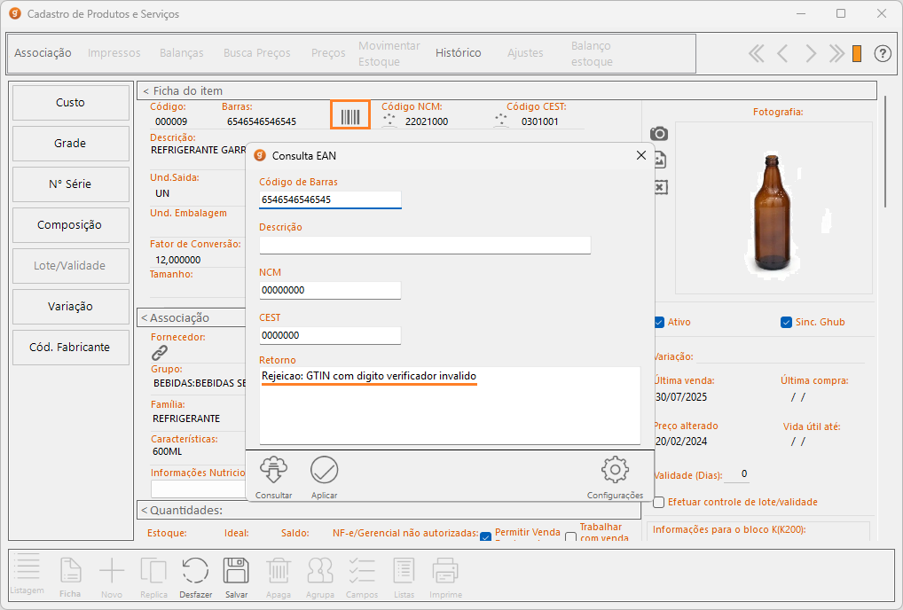 - Barras: Código de barras EAN/GTIN do produto. Este campo aceita apenas códigos numéricos de 8, 12, 13 ou 14 dígitos, exceto para produtos pesáveis (códigos iniciados em 2), quando são aceitos 5, 6 ou 7 dígitos. Apenas os códigos de barras no padrão com 8, 12, 13 ou 14 dígitos constarão na NF-e.