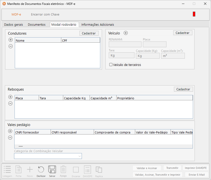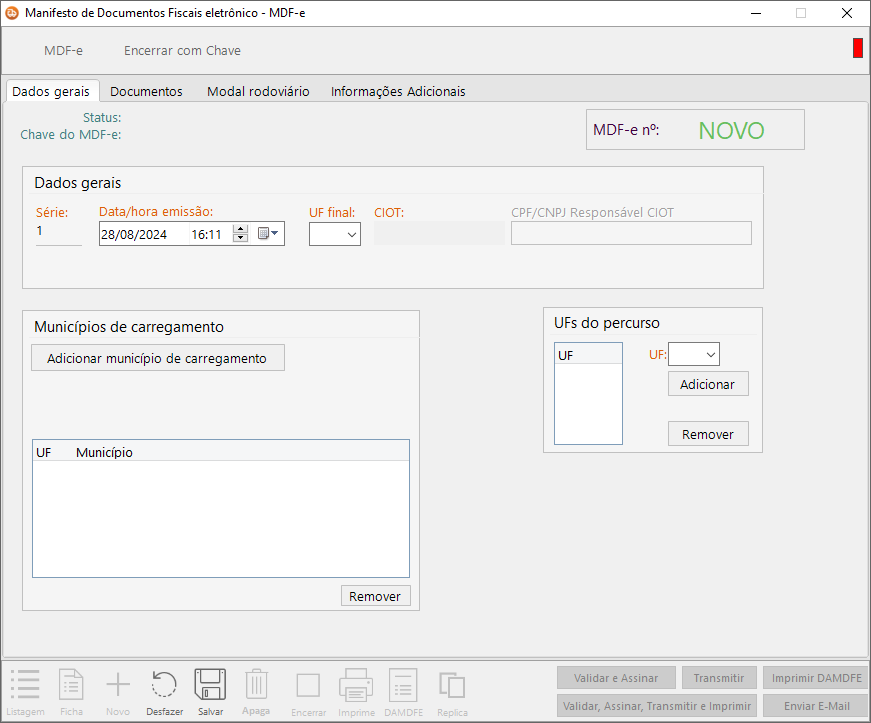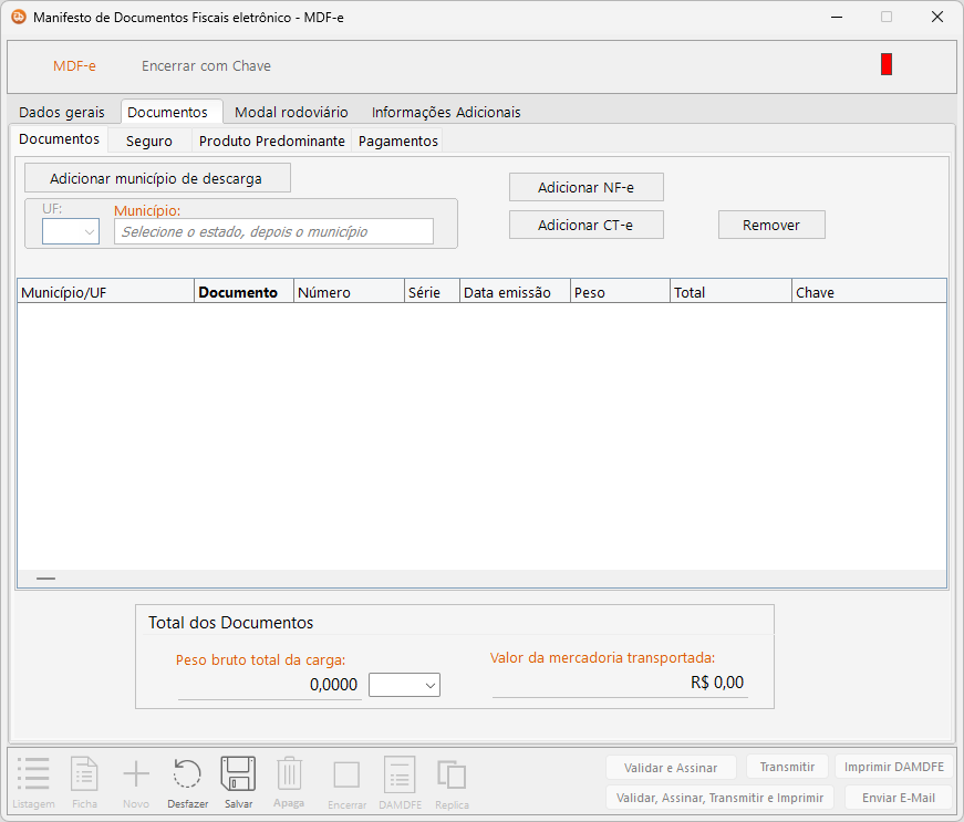 • Validar e assinar: gera e assina o XML do MDF-e, permitindo a impressão do DAMDFE. Nesta etapa não há valor fiscal, apenas validação.