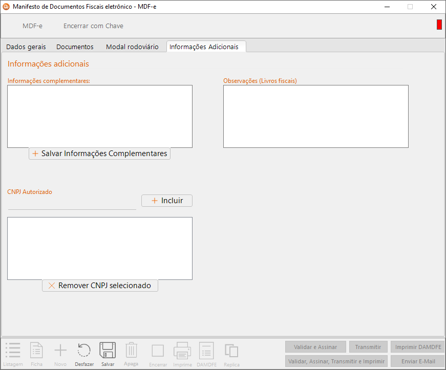 • Observações (livros fiscais): informação das observações do MDF-e que irão para os livros fiscais.