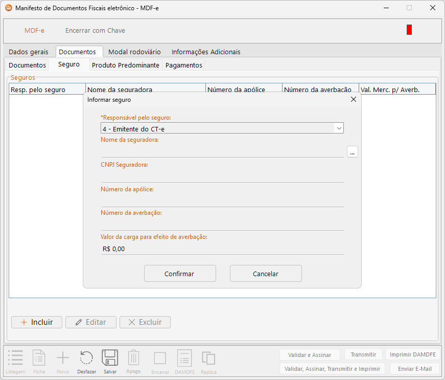 Todos os transportadores rodoviários deverão informar os dados do seguro com sua devida averbação junto à seguradora no MDF-e. Clique no botão “Incluir” e informe os dados: