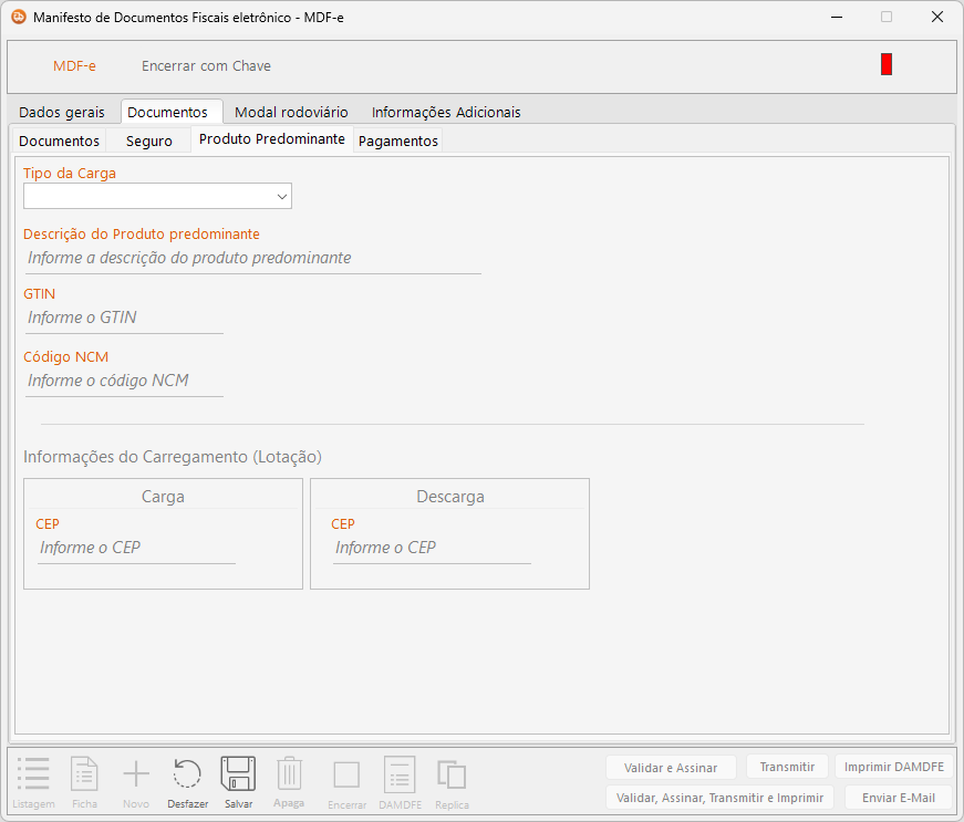 • Informações do carregamento: campos para informar o CEP do local de carga e descarga do produto.