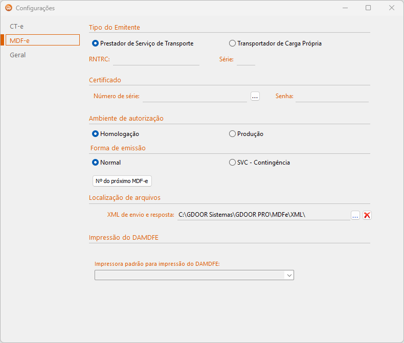 • Nº do próximo MDF-e: é utilizado para informar o número do último documento fiscal emitido pelo CNPJ do cliente. Após defini-lo, o GDOOR iniciará a emissão sequencial.