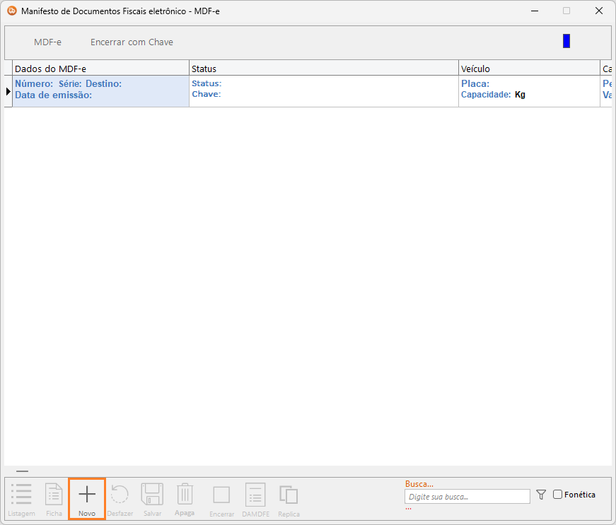A tela com a listagem de MDF-e será aberta, clique no botão “Novo” na parte inferior da tela.