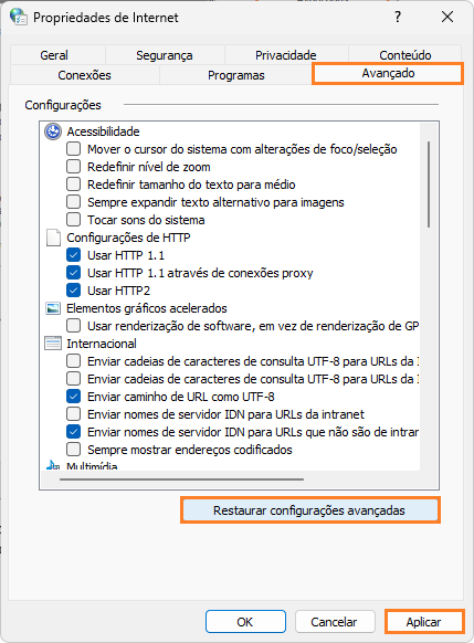 Com a janela aberta, acesse a guia “Avançadas”, clique no botão “Restaurar configurações avançadas” e clique em “Aplicar”.