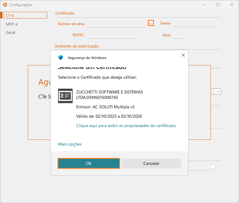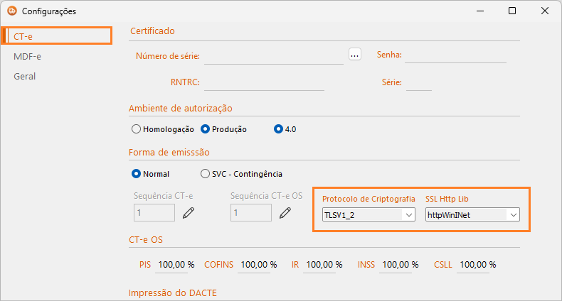 No Gct-e, acesse Configurações e “CT-e”. Ajuste as configurações: