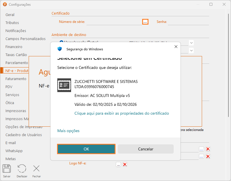 No retaguarda do sistema, acesse o ícone Configurações e NF-e produtos. Ajuste as configurações: