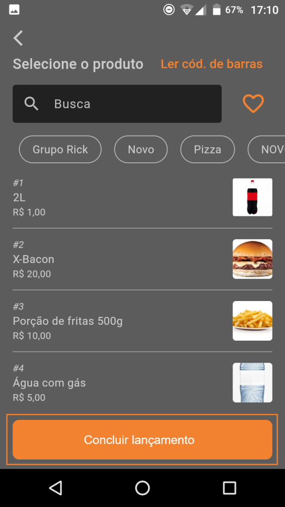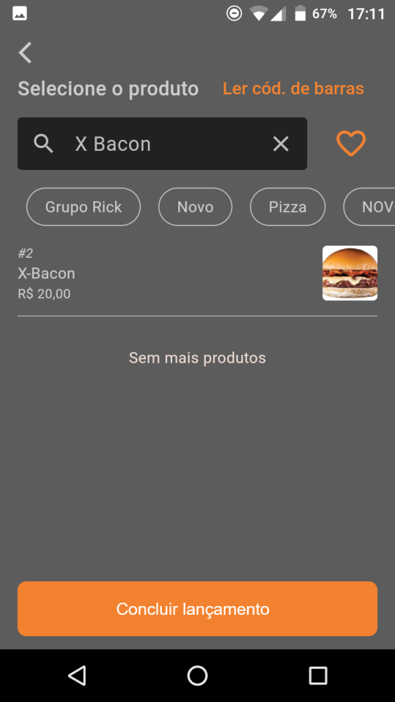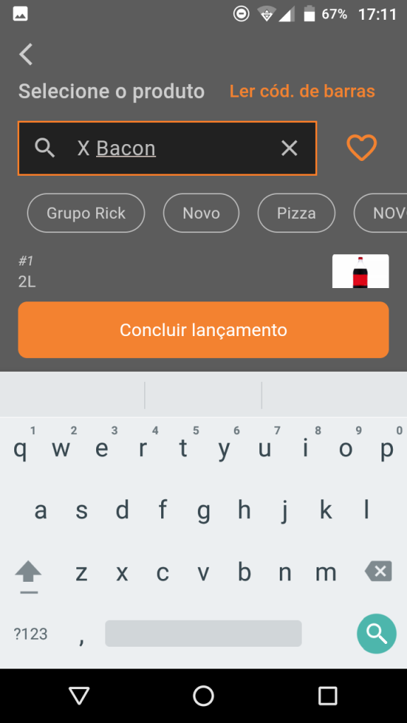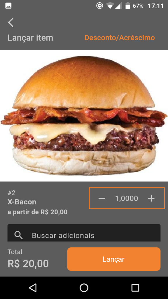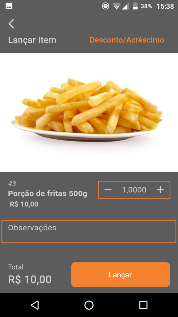 Para os clientes que não utilizam o cadastro da gestão de grupos e adicionais, na tela apresentada do app, informe a quantidade do produto, desconto/acréscimo ou uma observação e clique no botão “lançar”.