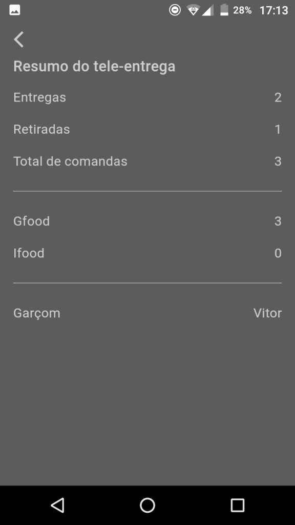 • Resumo do tele-entrega: esta opção mostra um resumo das entregas. Será apresentada a quantidade de entregas, a quantidade de retiradas no estabeleciomento e o total de comandas lançadas. O resumo também apresenta quantas entregas foram feitas por meio do gfood ou do ifood, além do garçom.