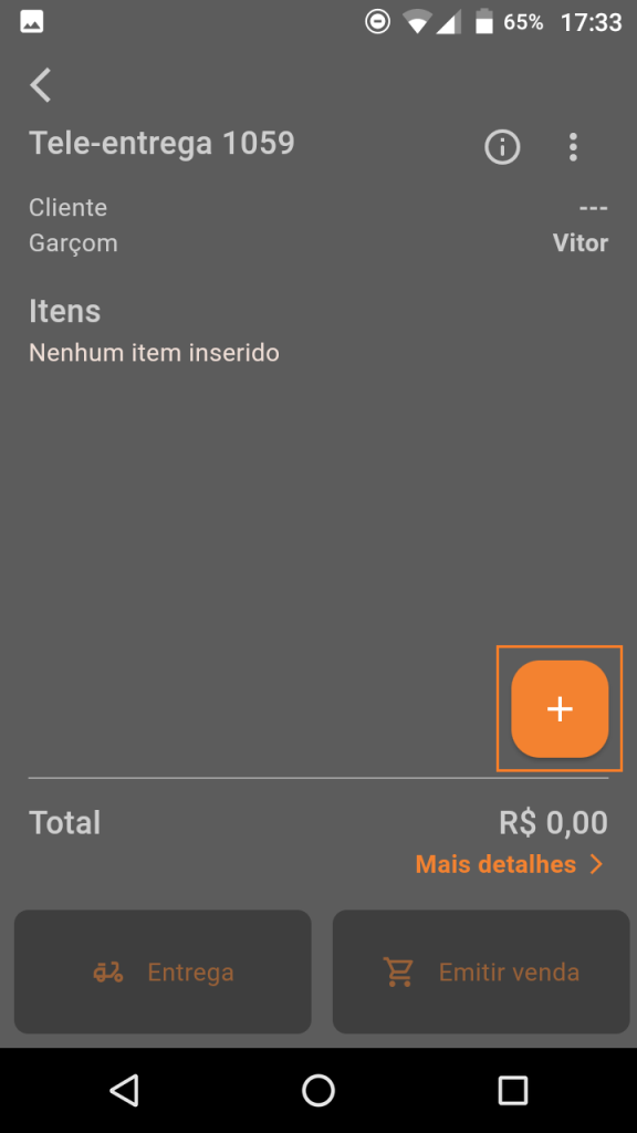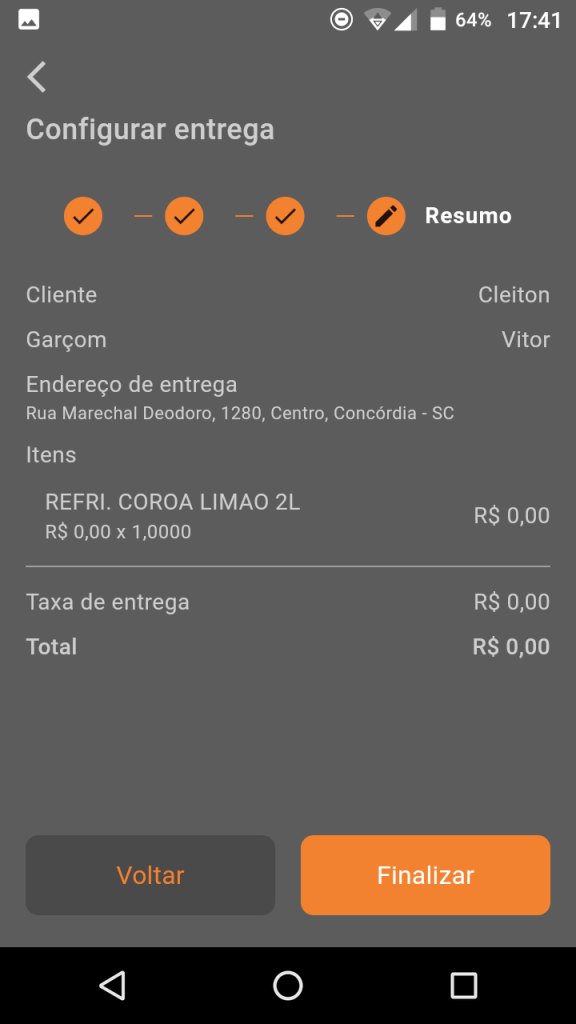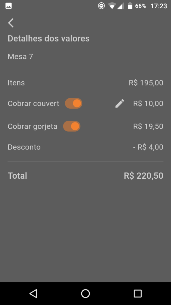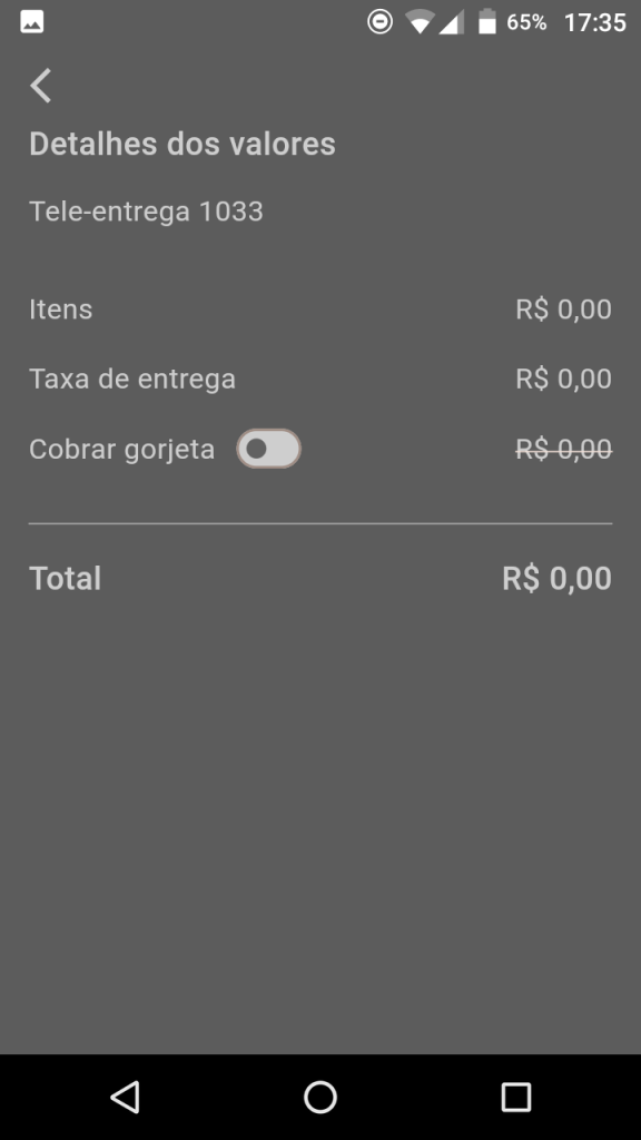 Serão expandidas informações sobre os valores adicionais cobrados para a entrega. Neste local é possível isentar a cobrança da gorjeta do garçom, conferir os valores dos itens, conferir o valor da entrega e o troco que o entregador deverá levar ao cliente.