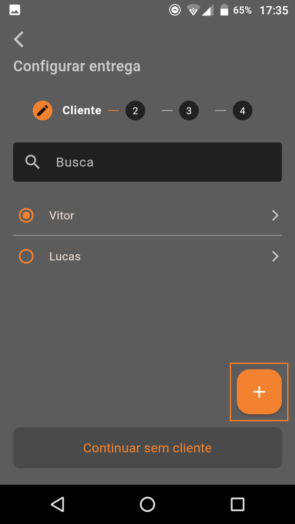 Ao clicar no botão entrega, selecione o cliente na listagem, cadastre um novo cliente ou clique em “continuar sem cliente”.