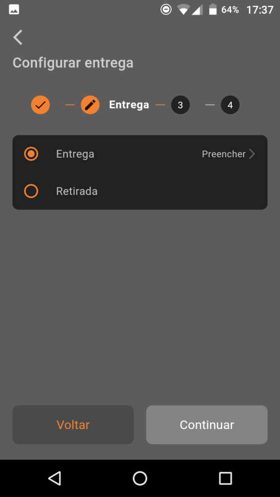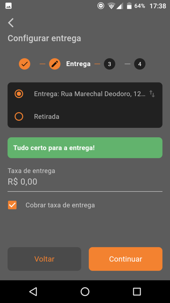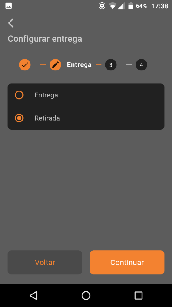 Marque a opção “retirada” e clique em “continuar”. O ícone do pedido será apresentado como uma “casinha”.