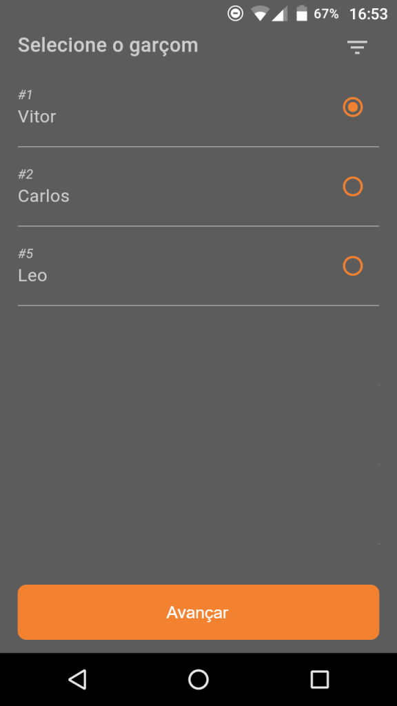 A primeira tela do app é a de seleção de garçom. Os garçons a serem selecionados são os que estão no “cadastro de vendedores” do GDOOR.