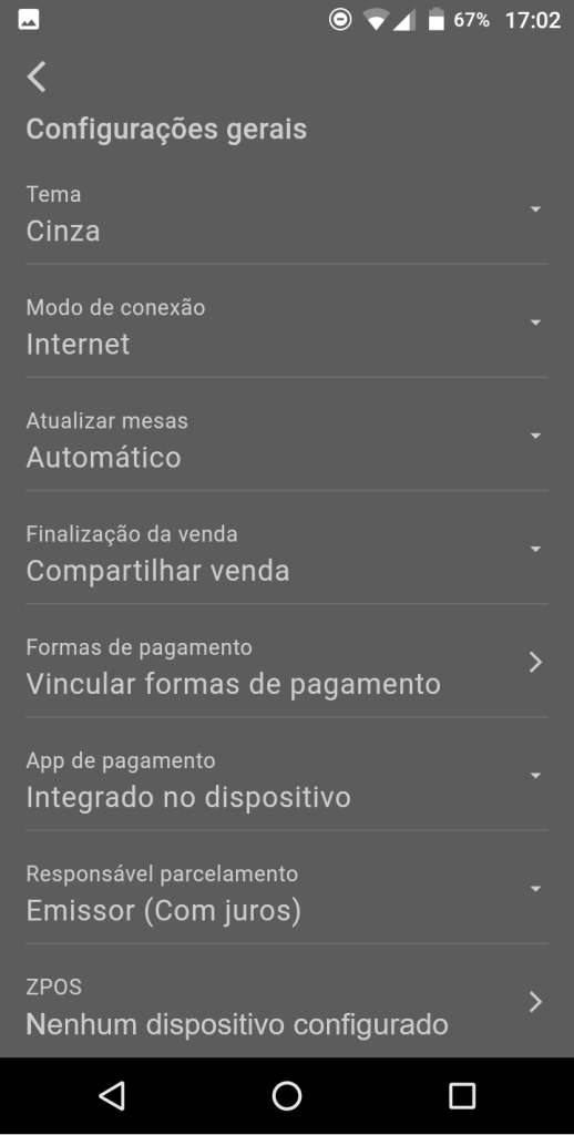 O menu Configurações gerais centraliza os ajustes principais do aplicativo, como tema, conexão, atualização de mesas, finalização da venda e integrações de pagamento.