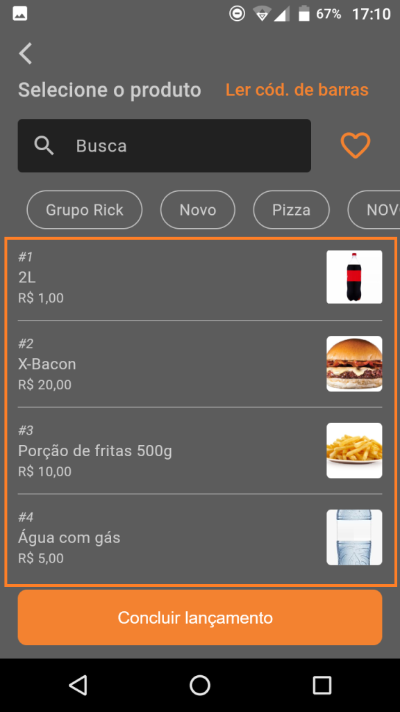 • Inclusão de produtos através de nome, código ou seleção por grupos e subgrupos;