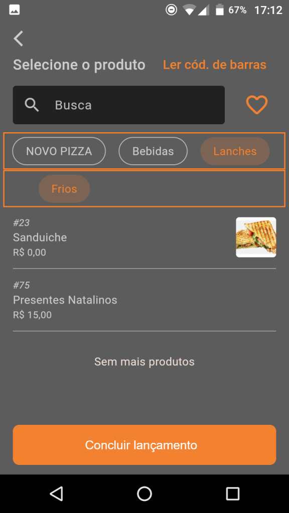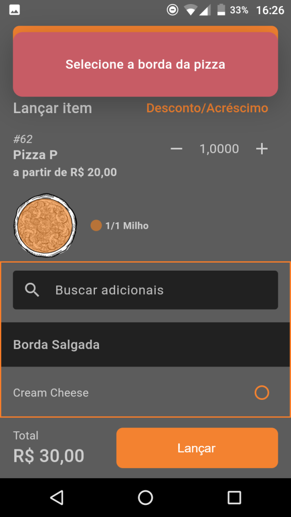 • Lançamento dos adicionais obrigatórios: se a empresa optar por trabalhar com escolha obrigatória de produtos nos lançamentos dos pedidos, a palavra “obrigatório” será apresentada e uma das opções deverá ser selecionada para prosseguir;