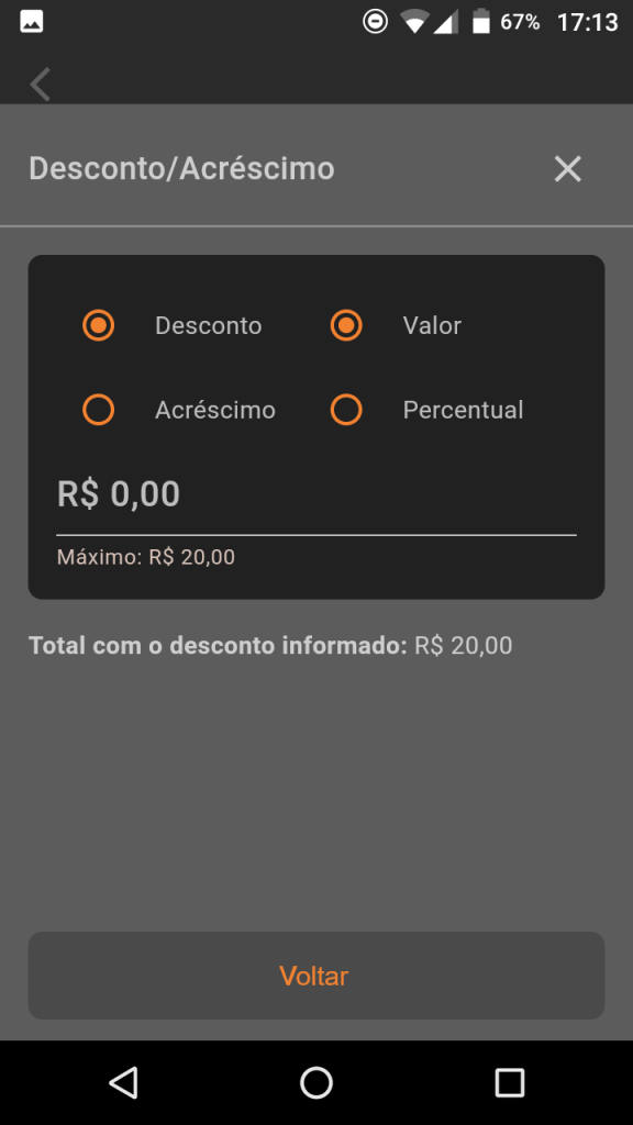 • Configurar desconto: é possível gerar um desconto ou acréscimo, em valor ou em percentual para a mesa.