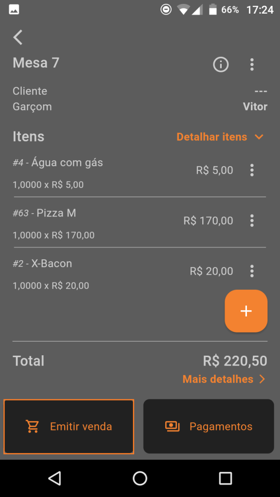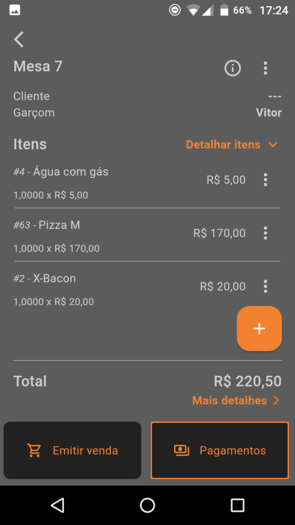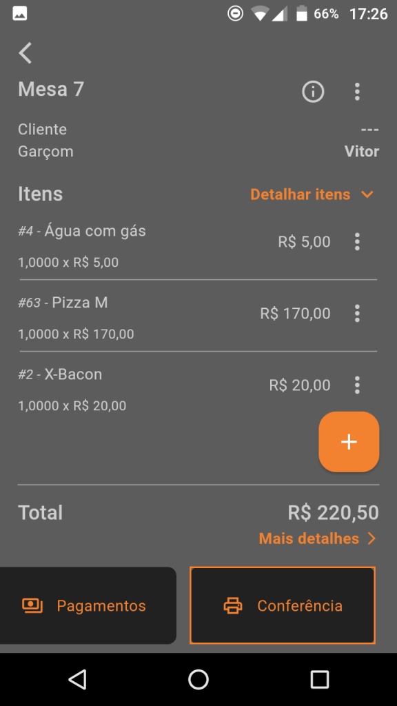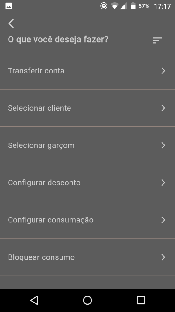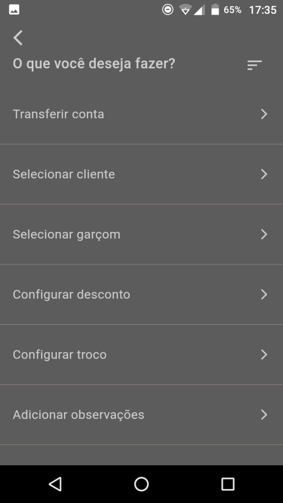 • Transferir conta: transfere a conta de uma mesa para outra. A mesa que recebeu os itens apresenta em cada item a mensagem “transferido da mesa …”;