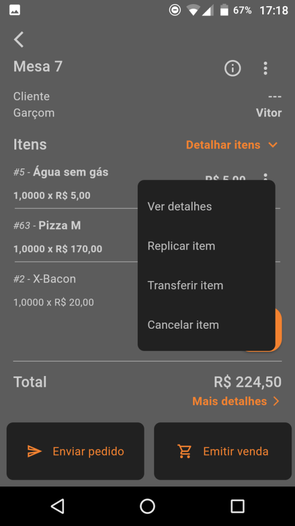 • Cancelar item: exclui o item do lançamento. Opção fica disponível somente até gerar uma impressão da mesa.