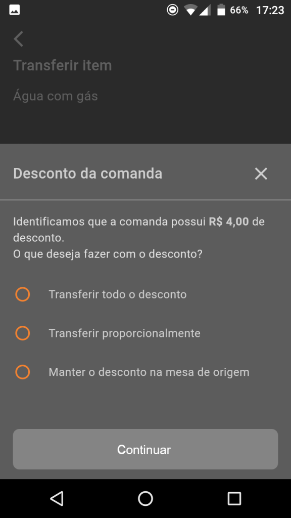 OBS.: Caso tenha gerado desconto no total da mesa, precisa informar o que deve ocorrer, se será transferido todo o desconto, transferido proporcionalmente ou se irá manter o desconto na mesa de origem.