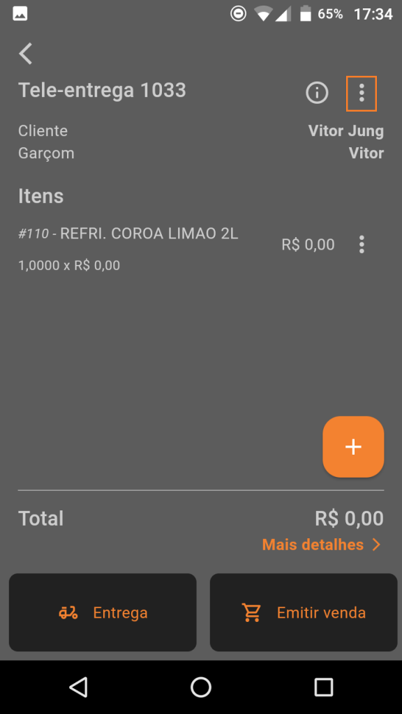 O menu superior direito do lançamento da tele-entrega será apresentado de forma resumida. Para acessar todas as opções, clique nos três pontos.
