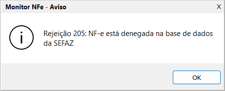 3. Rejeição 205: NF-e está denegada na base de dados da SEFAZ