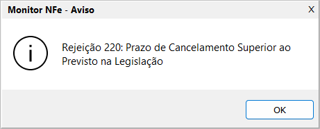 Quando for realizada a tentativa de envio do Evento de cancelamento para uma NF-e cujo prazo de cancelamento excedeu o limite definido pela SEFAZ.