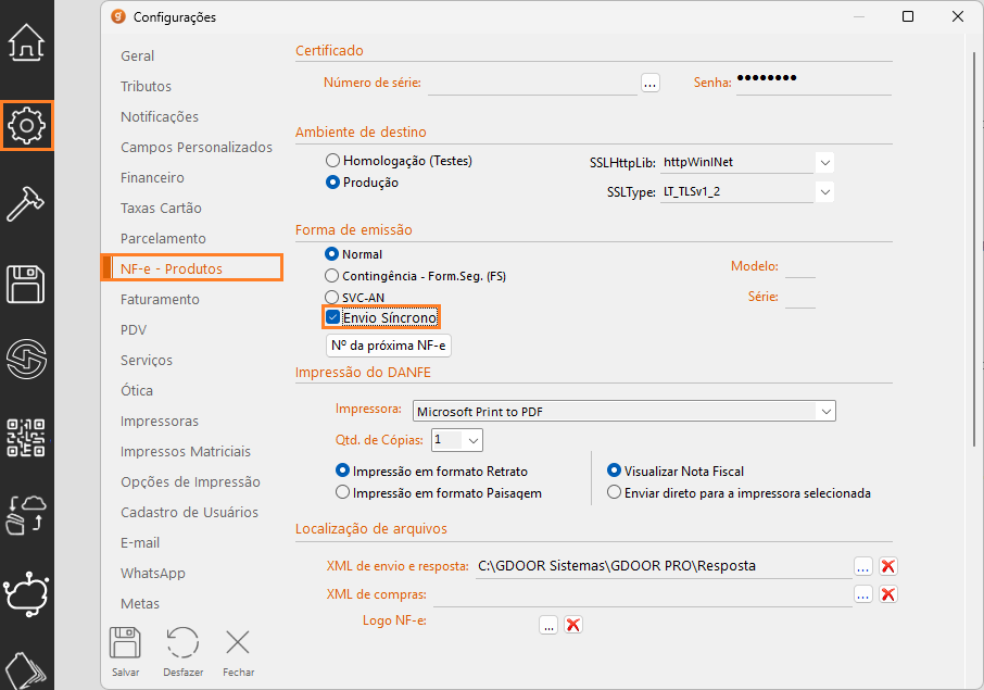 No Gdoor, acesse o ícone “Configurações” do sistema e selecione a aba de “NF-e Produtos”. Marque a opção “Envio síncrono”.