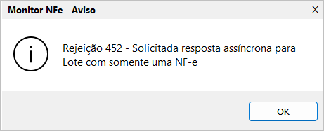 Ocorre quando uma NF-e é enviada de forma assíncrona em lote com apenas um documento. O envio assíncrono só é permitido para lotes com duas ou mais notas fiscais.