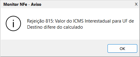 Quando emitir uma NF-e na qual o valor da partilha do ICMS para a UF de destino no XML for diferente do valor calculado pela SEFAZ.