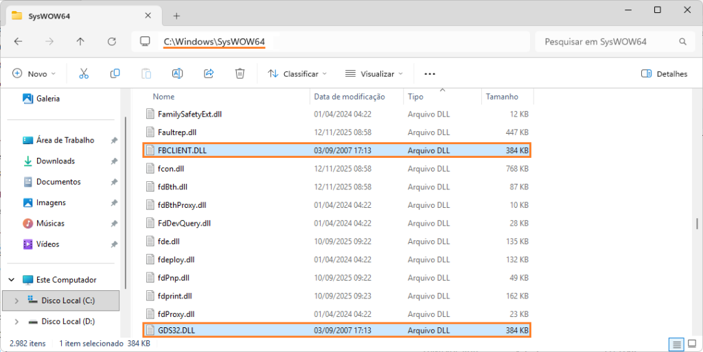 Na pasta C:\Windows\SysWOW64, localize e exclua os arquivos “FBCLIENT.DLL” e “GDS32.DLL”.