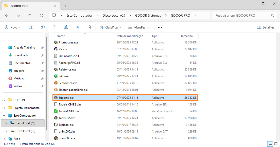 Acesse a pasta do sistema, localizada no endereço C:\GDOOR Sistemas\GDOOR PRO (SLIM/MEI), localize e execute o “Suporte.exe”.
