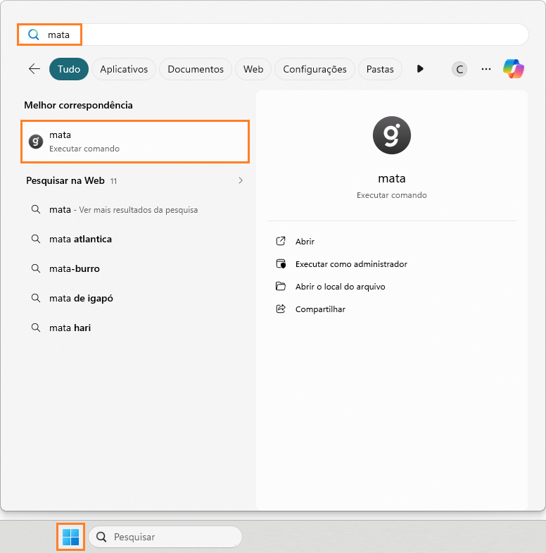 Ao finalizar a desinstalação, clique no menu “Iniciar“ do Windows e digite a palavra “mata”. Selecione o executável responsável por encerrar todos os processos do sistema Gdoor e do Firebird.