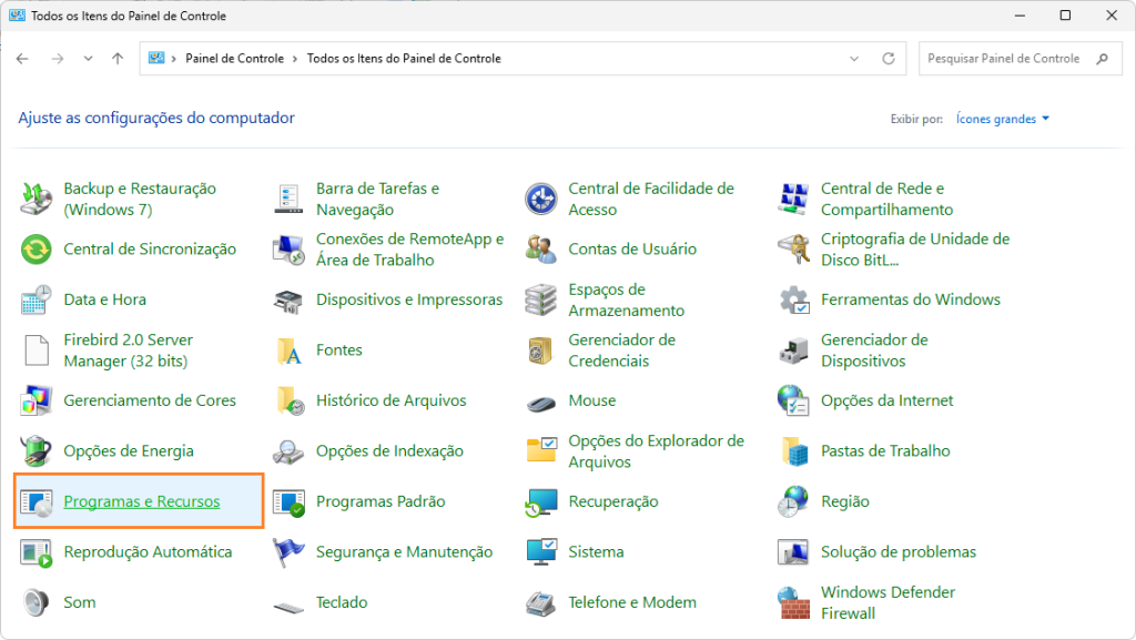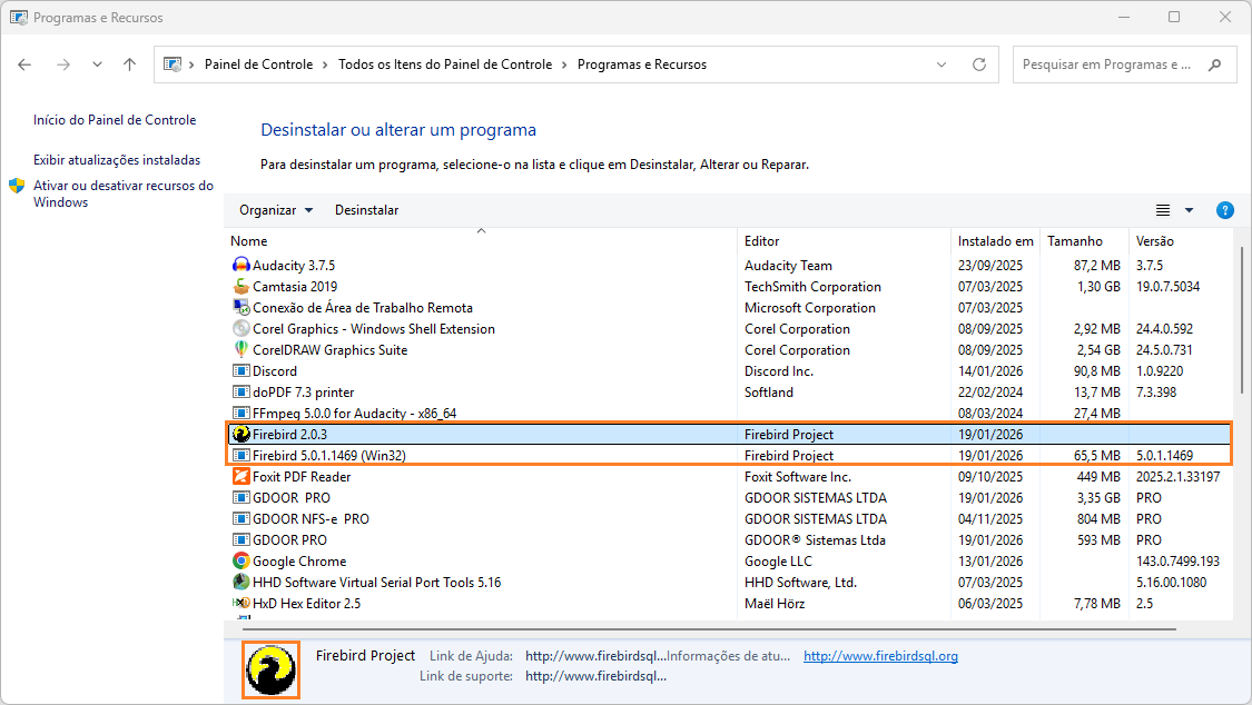 Confira na listagem apresentada se existe a instalação do “Firebird 2.0.3”, “Firebird 5.0.1” ou ambas.